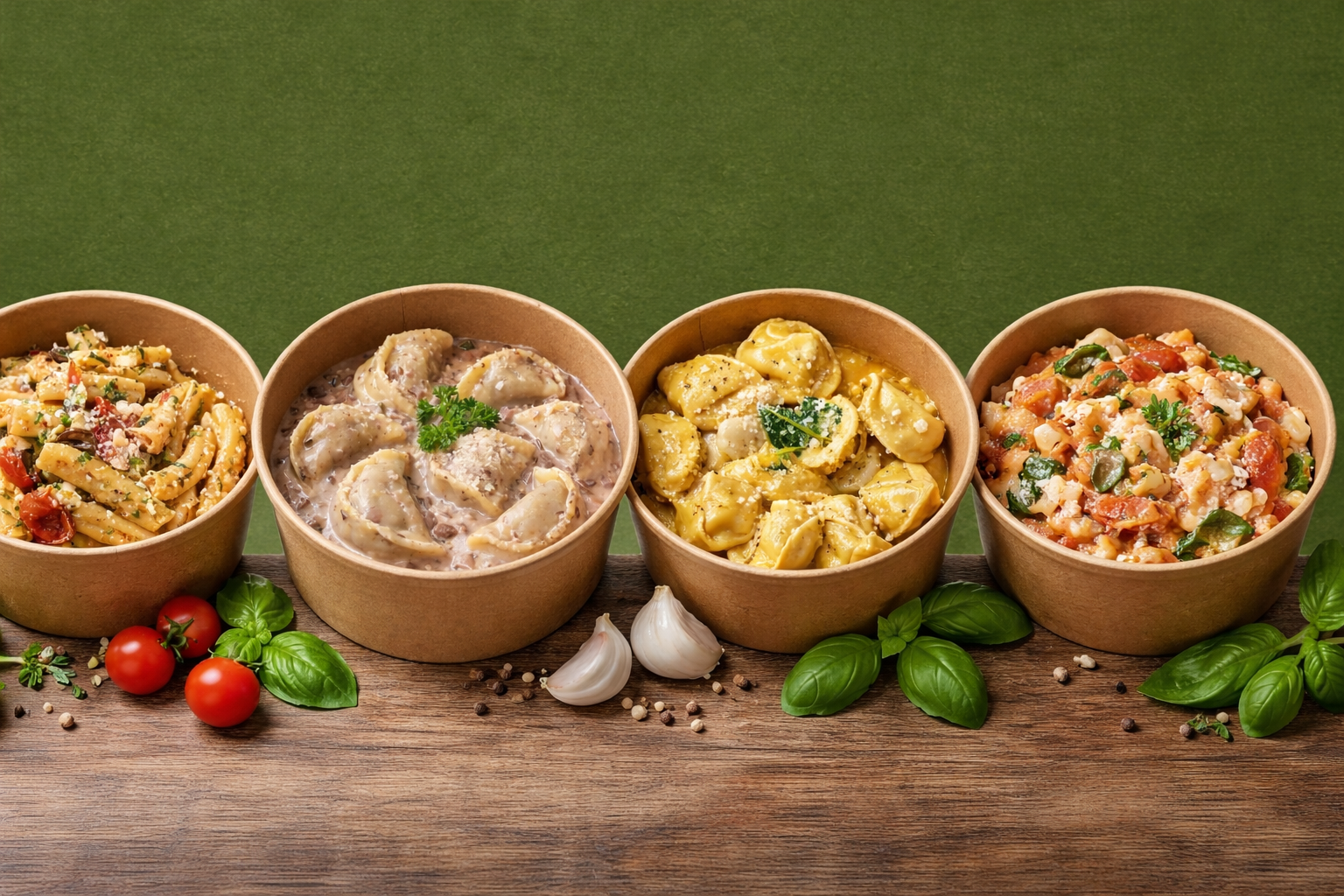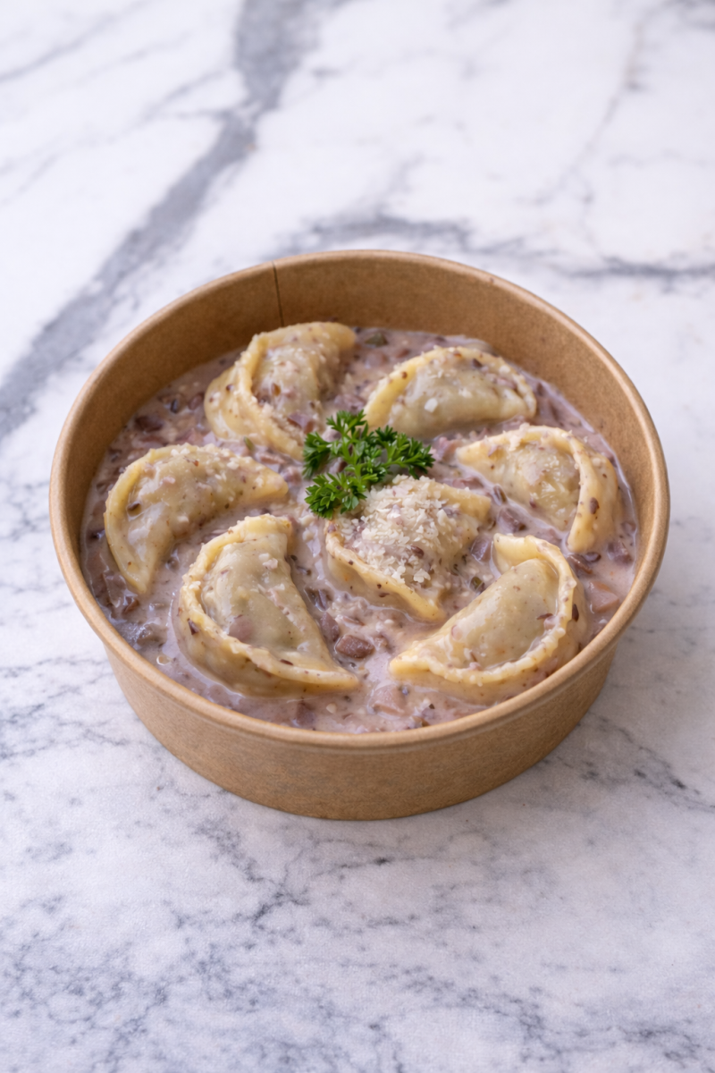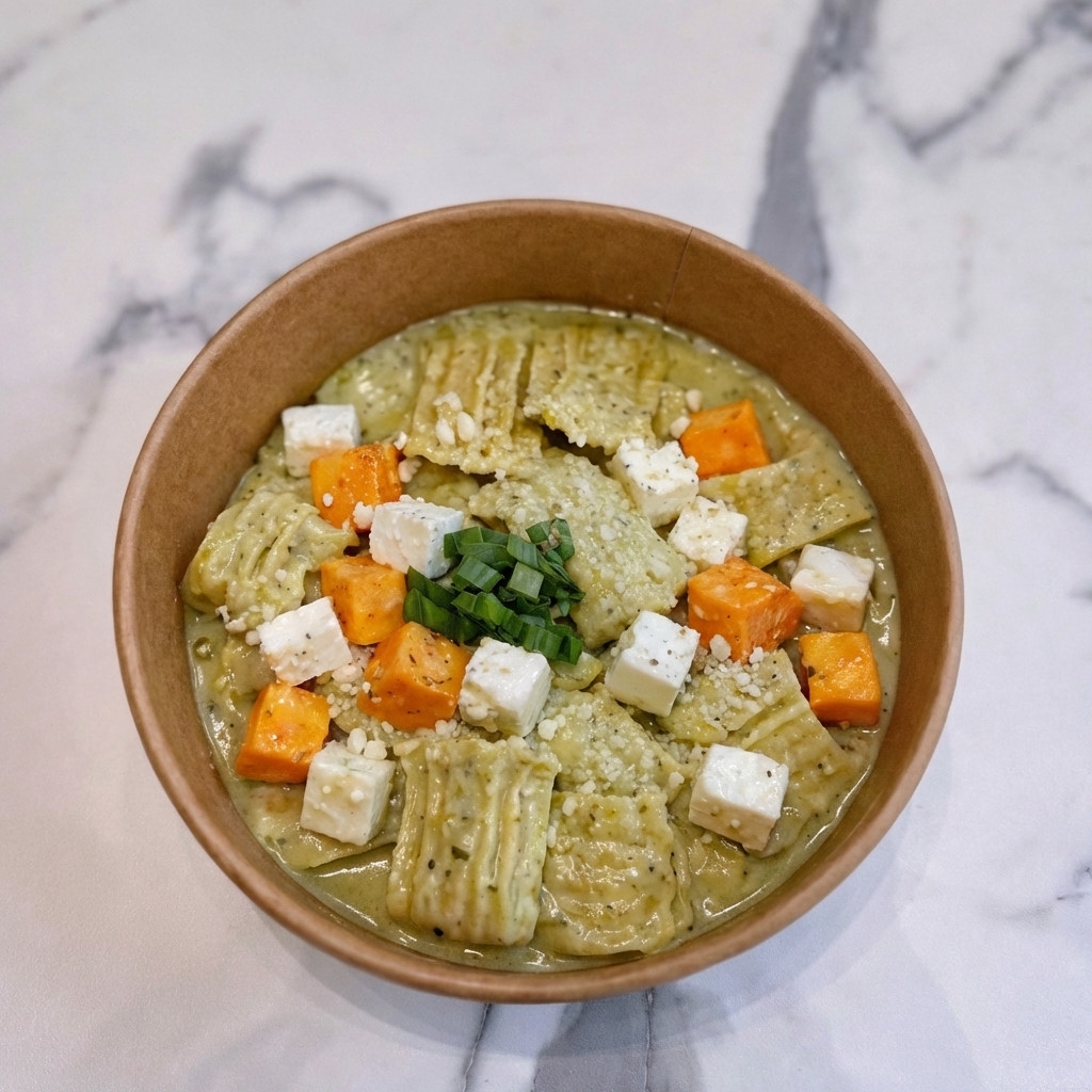 רביולי בטטה, שמנת פסטו,קוביות בטטה וקוביות בולגרית