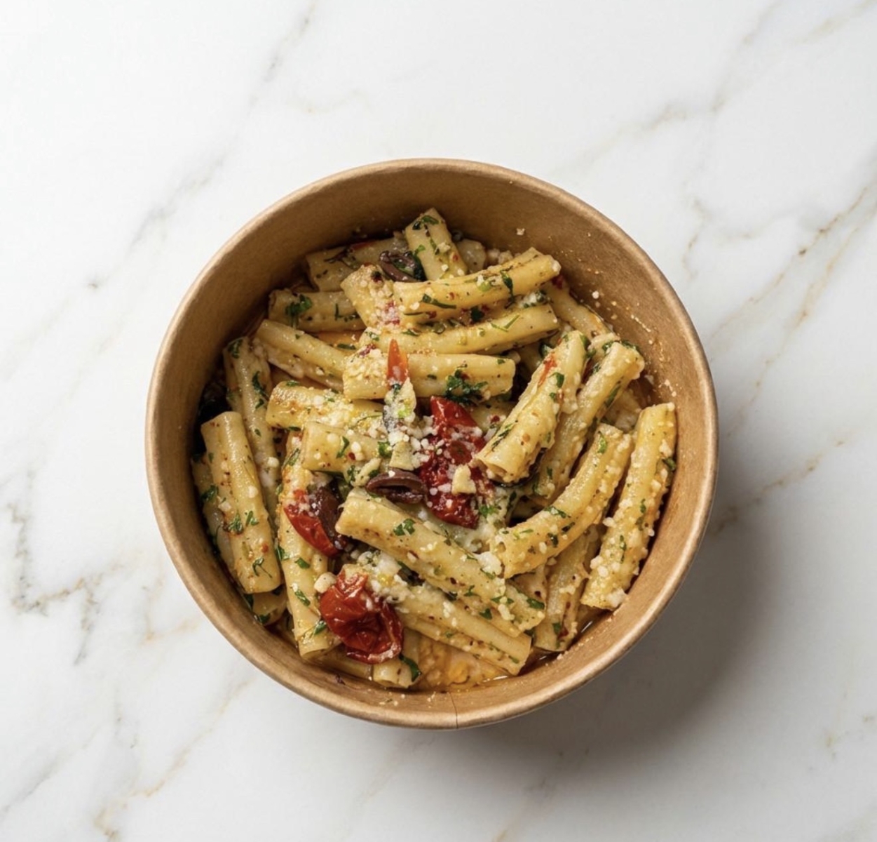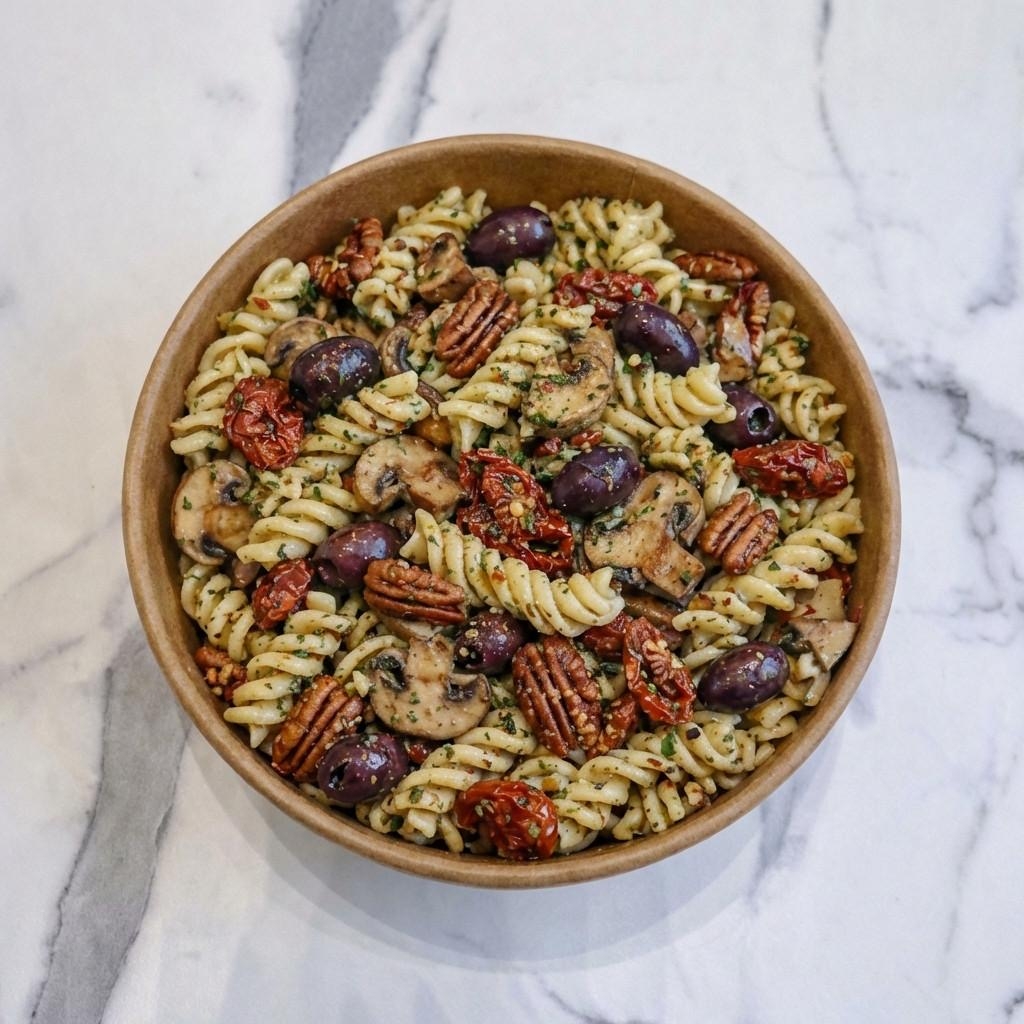פסטה פוזילי, פטריות ועגבניות צלויות, קלמטה