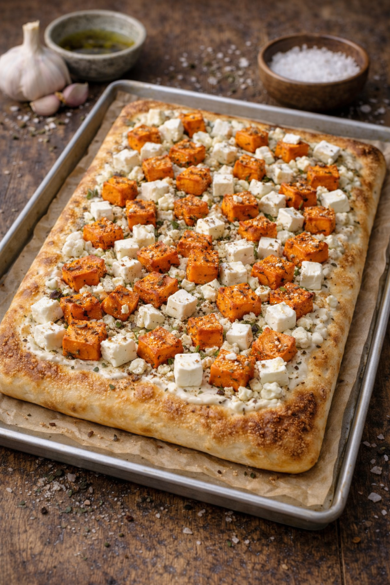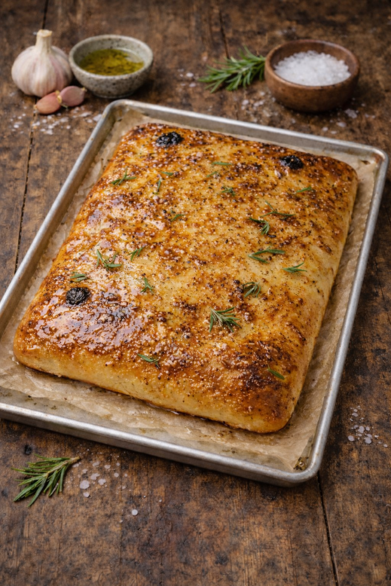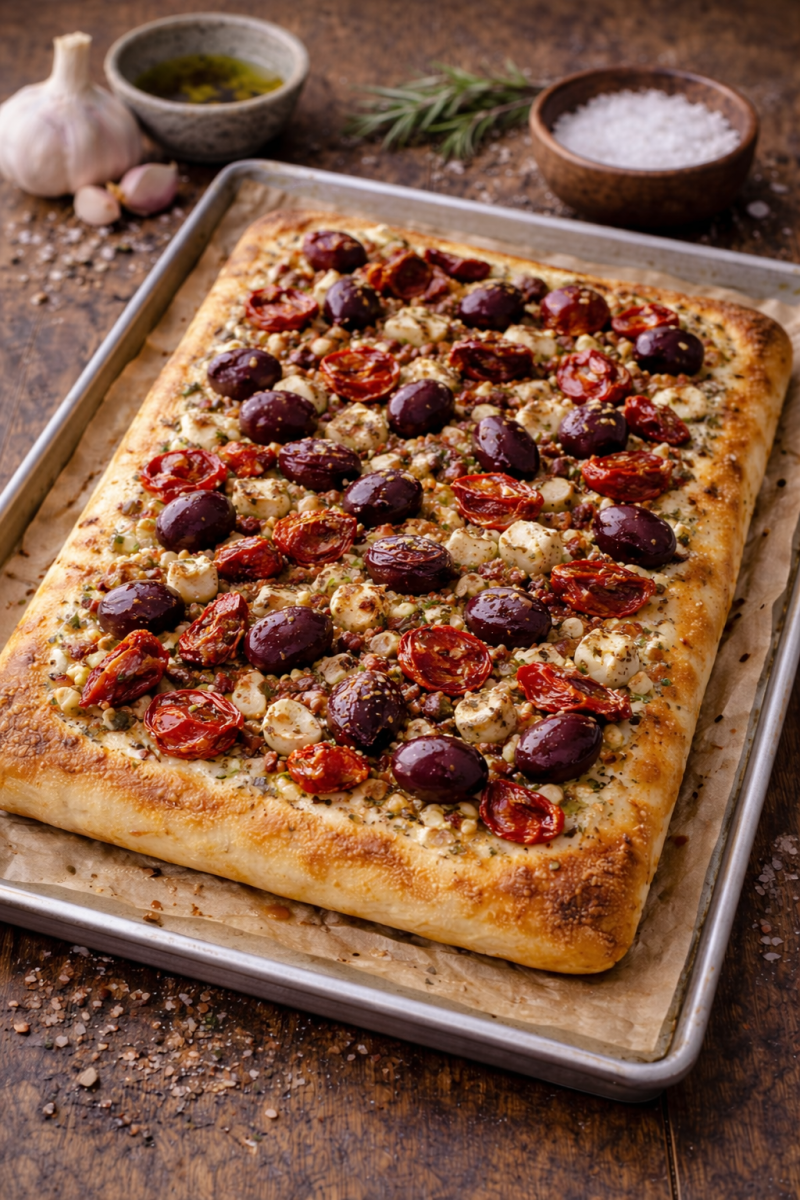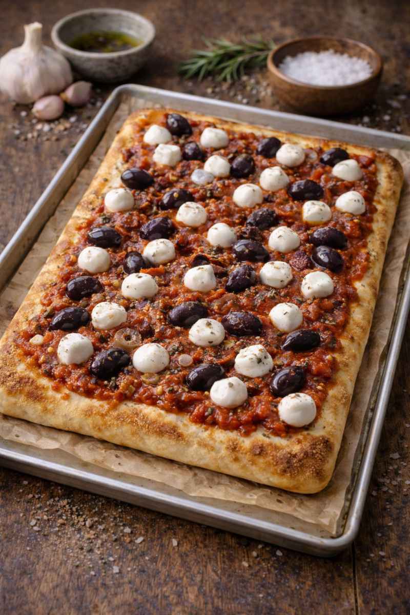 פוקצ׳ה, רוטב עגבניות, מוצרלה לבנה.