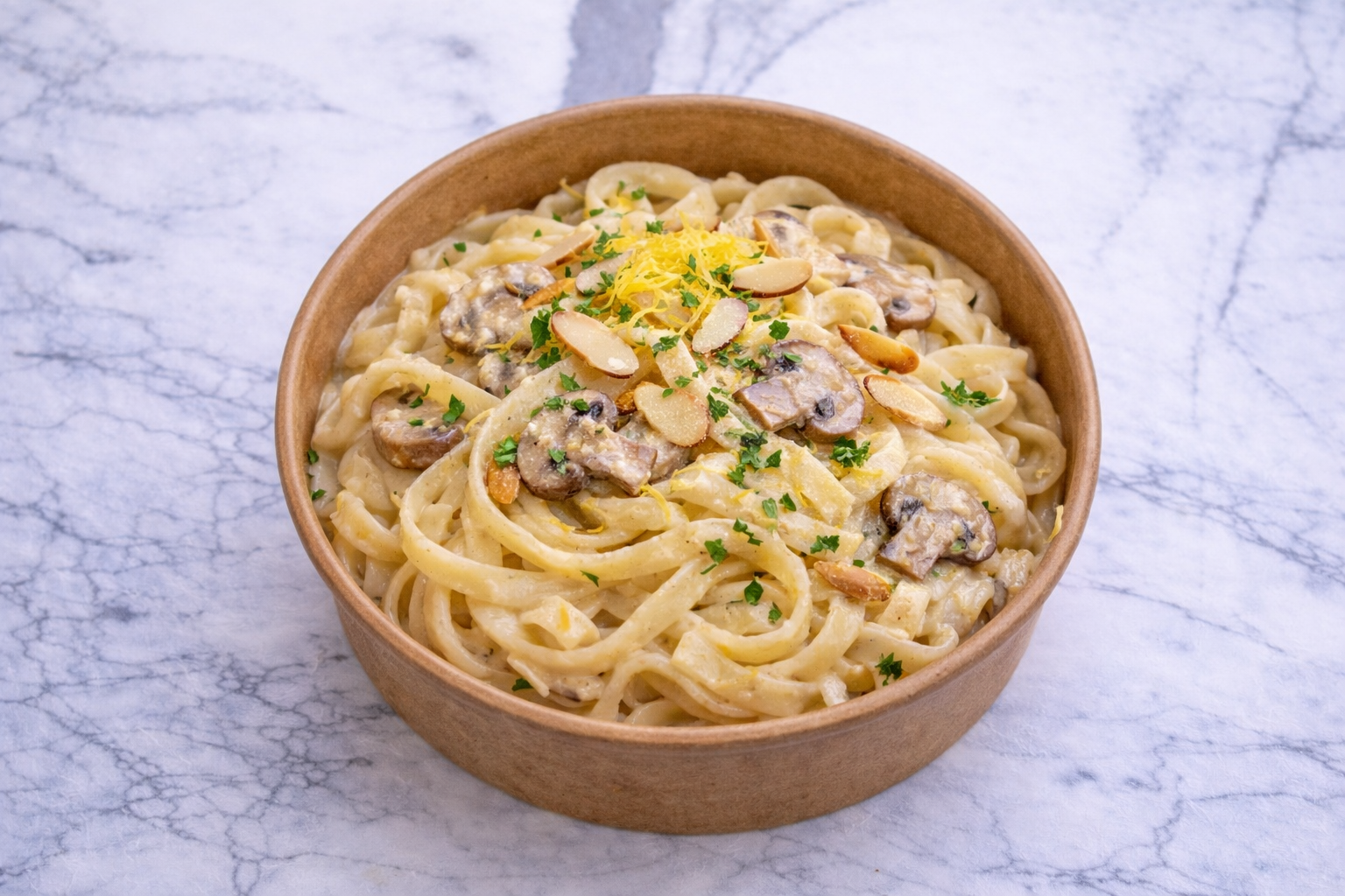 פטוציני, שמנת, פטריות, גרידת לימון ושקדים